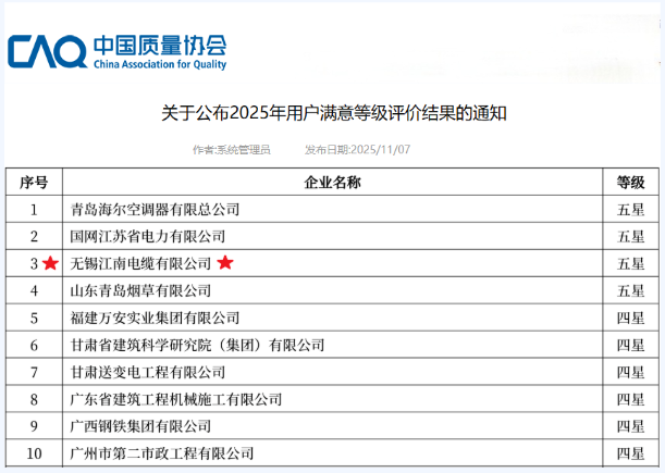 【喜報(bào)】江南電纜榮膺 “用戶滿意五星級(jí)企業(yè)” 稱(chēng)號(hào)!